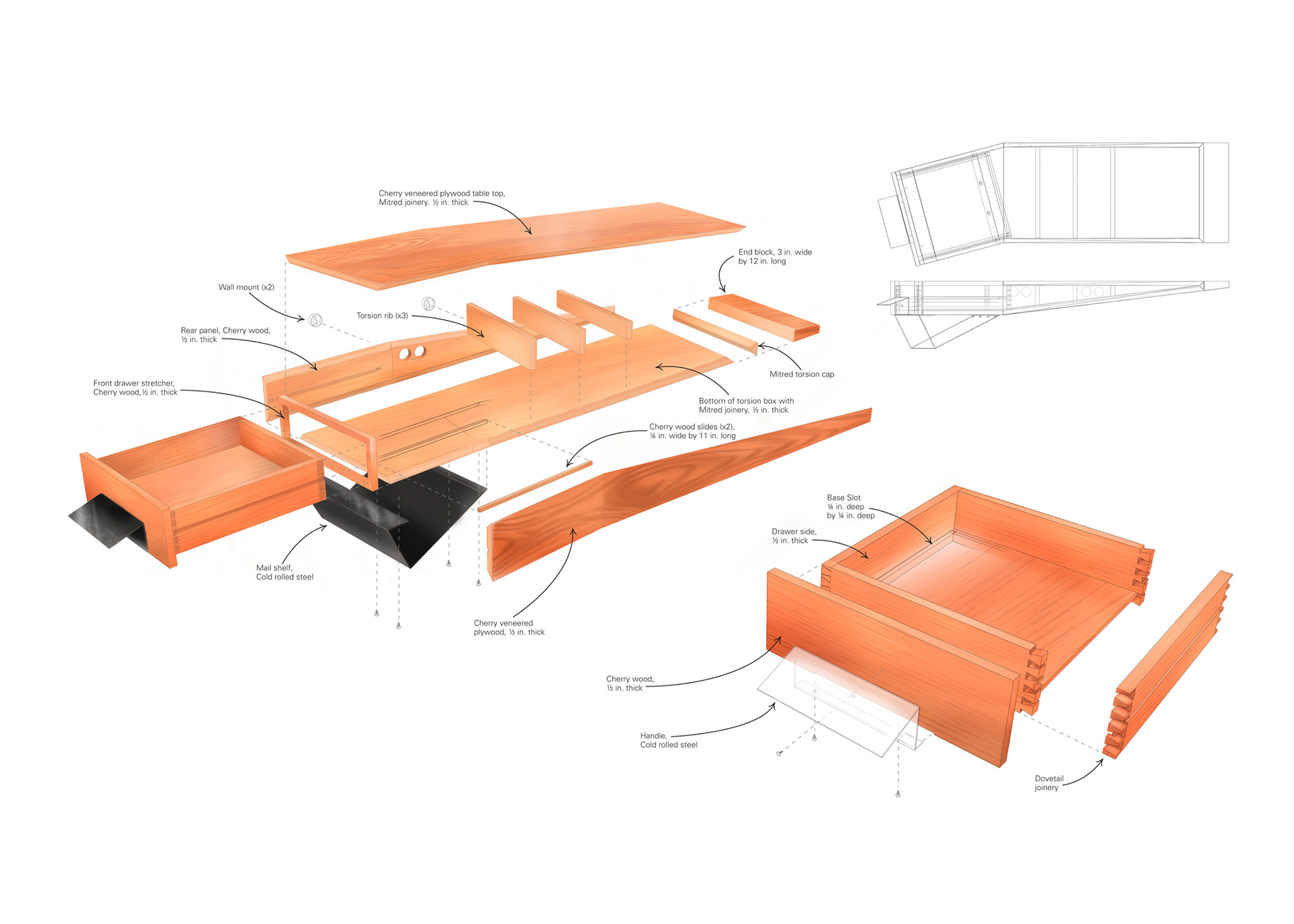 The metal used for the drawer and mail storage is cold rolled eighteen gauge steel. The steel is first tapped in appropriate places to allow for it to be connected to underside of the table. The same process is repeated to allow for the drawer to be attached to the drawer face. The metal is then bent on a break to the desired angles and covered in a natural beeswax finish.