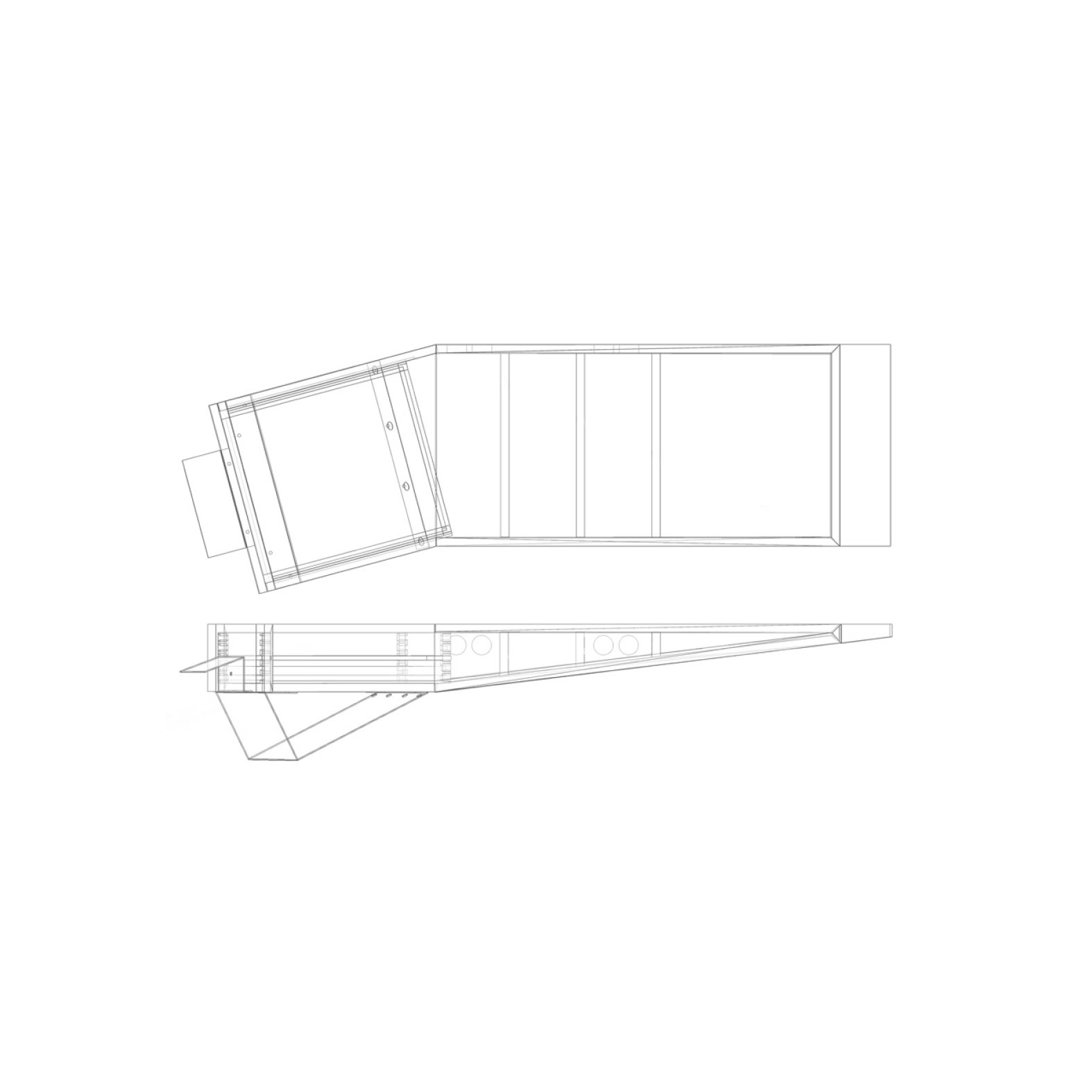 The result was a rectangular shaped table which is angled from the wall at one end and tapered at the other. A small drawer is found facing the hallway and is accessed by pulling on the bent metal handle. The handle relates to the angled metal that can be found on the underside of the table that can be used for temporary storage. The drawer pull relates to the bent metal under the table through its material choice and continuation of angles. The drawer is large enough to hold cell phones, wallets etc., and is angled towards the hall to make it easier to access these items as one is leaving the home.