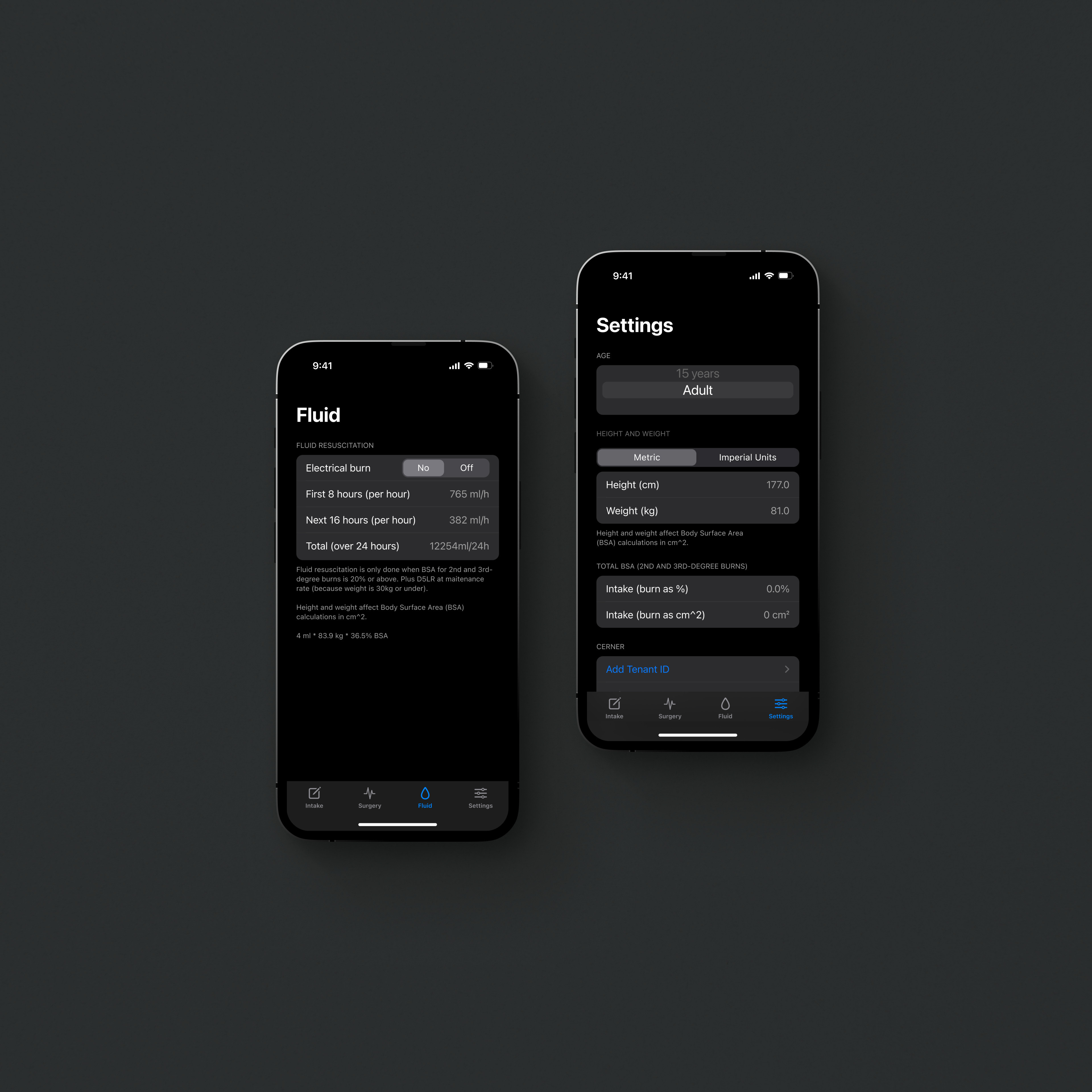 We introduced an onboarding experience to direct the user down the intended path for wound care intake, dressings, burn intake, surgery and fluid resuscitation. Since height and weight affected Body Surface Area (BSA) calculations, we asked for this information upfront in order to display calculations correctly in the UI.